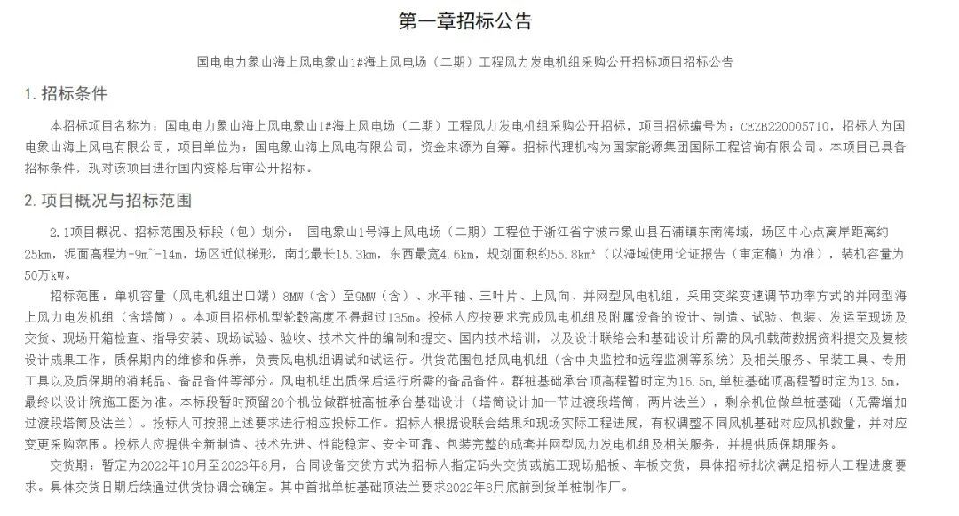 招標文件要求單機容量8MW(含)至9MW(含)風力發電機組。交貨期暫定為2022年10月至2023年8月。
