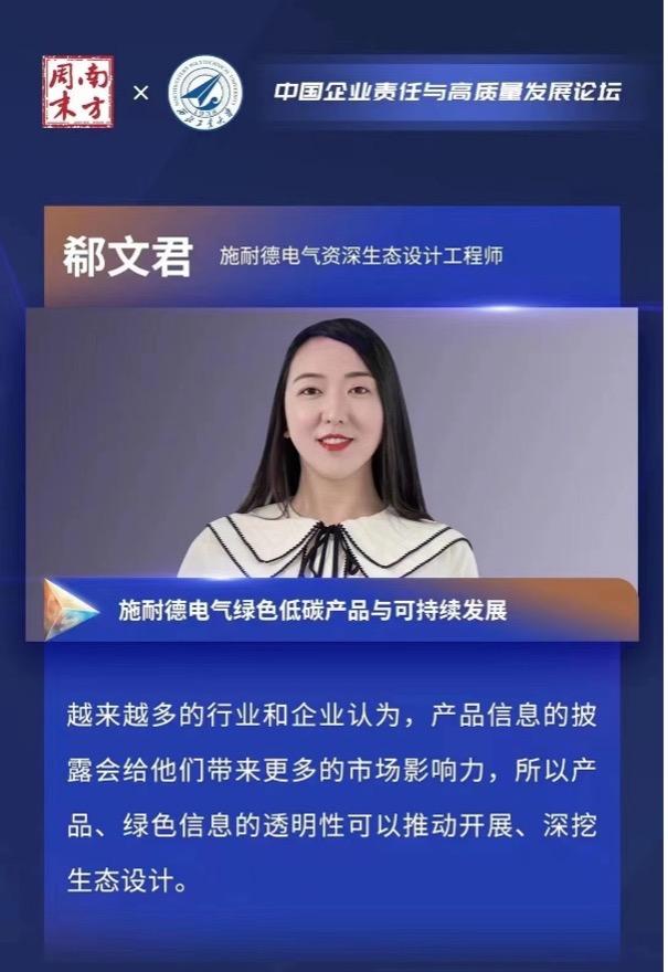 近日,施耐德電氣資深生態設計工程師郗文君在2022中國企業責任與高質量發展論壇上,圍繞綠色低碳產品與可持續發展話題發表演講。郗文君認為:“產品環境信息透明性有助于擴大企業市場競爭力,是深挖生態設計的重要驅動力。”