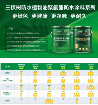 三棵樹植物油聚氨酯防水涂料的面市解決了建筑聚氨酯防水涂料中含有有毒增塑劑的防水涂料技術瓶頸問題;大大降低聚氨酯涂料使用過程中VOC的排放量,保護施工工人生命安全,助力防水材料高品質發展,推進行業低碳化和可持續發展方向進程。