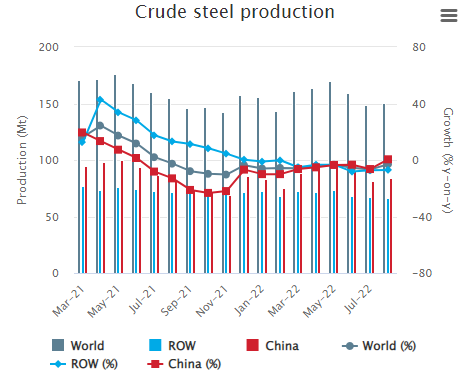 世界鋼鐵協會發布的初步數據顯示,2022年8月份,全球64個納入世界鋼鐵協會統計國家的粗鋼產量為1.51億噸,同比下降3.0%。