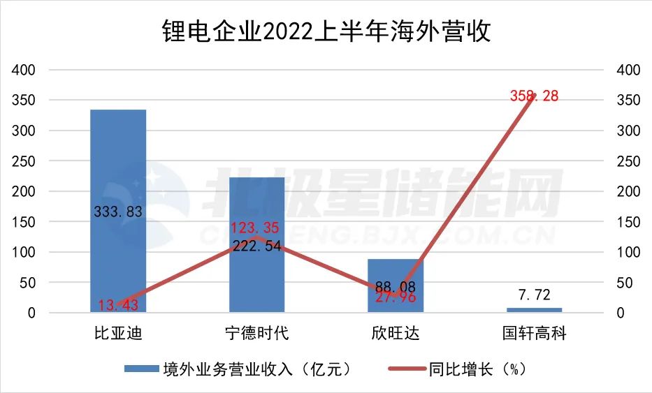 多家儲能企業信息顯示,近年來,中國儲能企業也在爭相布局海外儲能市場、加速儲能產品出海。2022年半年報顯示,作為我國鋰電池四大主要廠商,寧德時代、比亞迪、國軒高科、欣旺達境外收入實現不同程度的增長,其中寧德時代海外業務營收翻倍,國軒高科海外營收同比增長358.28%。