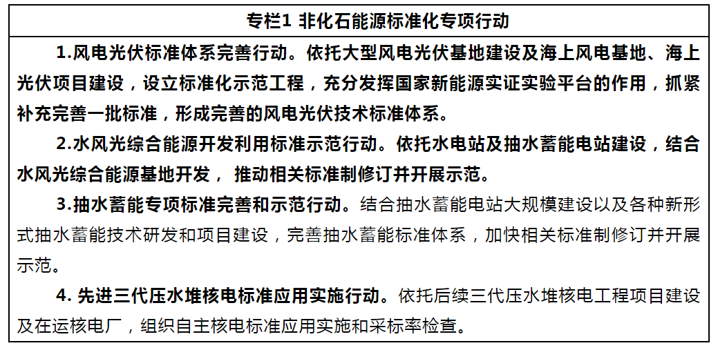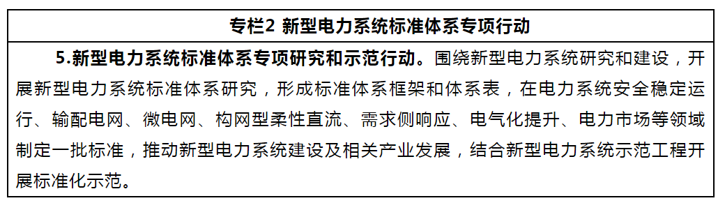 ——建立完善以光伏、風電為主的可再生能源標準體系,研究建立支撐新型電力系統建設的標準體系,加快完善新型儲能標準體系,有力支撐大型風電光伏基地、分布式能源等開發建設、并網運行和消納利用。