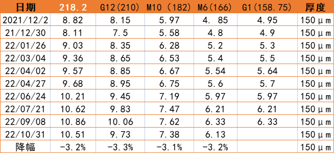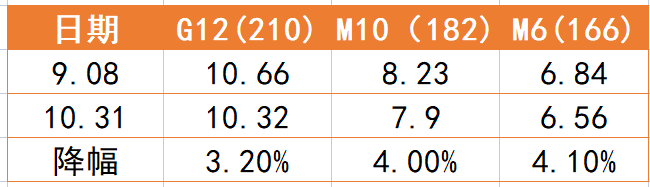 10月31日,TCL中環(huán)發(fā)布新一輪單晶硅片價格,各尺寸硅片價格統(tǒng)一下降0.35~0.2元/片,降幅在3%~4.1%之間。根據(jù)官網公布價格,單晶硅片P型150μm厚度分別降價約0.35、0.33、0.24、0.2元/片,較上月環(huán)比下降3.1-3.2%;N型150μm厚度價格較上月環(huán)比下降3.2-4%,N型M130μm厚度環(huán)比下降3.4-4.1%。