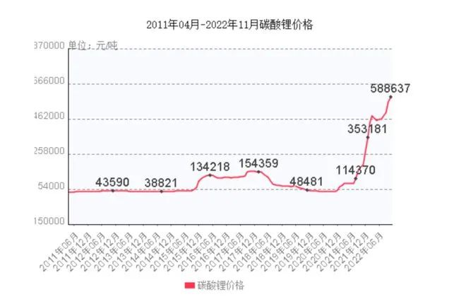 數據顯示,自11月電池級碳酸鋰價格行情正式突破60萬元/噸之后,截至目前持續高位盤整,相較去年年初,漲幅達到1057.7%,創下歷史新高記錄。對此,寧德時代等電芯大廠也曾多次喊話,碳酸鋰超過50萬元/噸,就無法承受,要采取反制措施。今年3月,寧德時代就被爆出減產的傳聞,當時也正值碳酸鋰均價突破新高之際,但碳酸鋰的價格還是從年初的每噸27.8萬元上逼近到如今的60萬元關口。