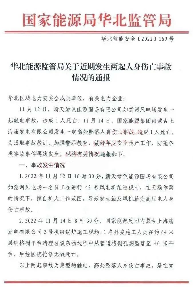 國際能源網/風電頭條(微信號:wind-2005s)獲悉,近日,華北能源監管局通報兩起人身身亡事故,其中一起為風電事故。
