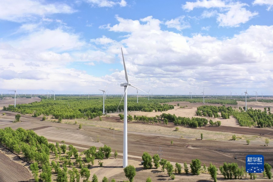 這是在吉林省白城市通榆縣興隆山鎮拍攝的風力發電站。新華社發(張玉博 攝)