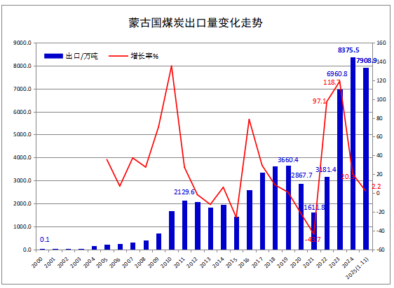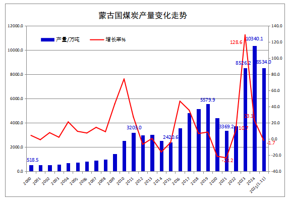 • 2025年前11個月蒙古國煤炭產量下降1.7%,出口增長2.2%