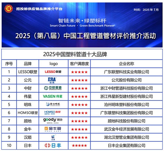 塑料管道以其輕質、耐腐蝕、流體阻力小、安裝便捷、節能環保等優勢,在眾多應用場景中不可或缺。2025年7月,招投標供應鏈品牌推介平臺隆重發布了"2025中國塑料管道十大品牌"榜單,集中展現了我國塑料管道行業領先企業的風采與實力。