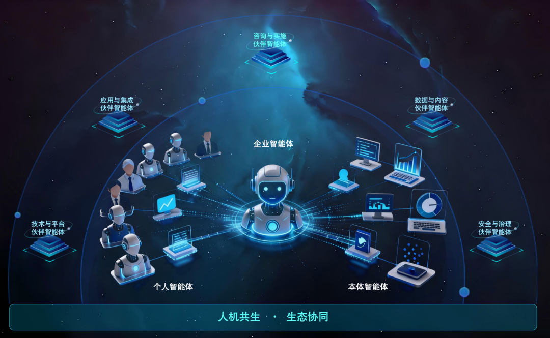 打造“組織即智能體、員工即節點”的分布式智能體網絡,如同給企業裝上“AI神經系統”,支持在企業級安全管控下組織與組織間、個人與組織間的業務智能協同,實現全域全場景AI能力全覆蓋,通過AI全局智能管控,打破組織壁壘,激活企業效能。