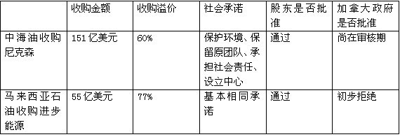這起被否的收購案使得中海油收購尼克森的前景蒙上陰影。分析不難發現,馬來西亞石油公司收購進步能源公司的要約承諾與中海油承諾基本相同,而馬來西亞石油收購溢價則明顯高于中海油報價。如下圖: