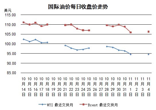 上一個交易日國際油價大跌,紐約WTI油價跌穿95美元大關。但11月4日,紐約WTI油價和倫敦布倫特油價均暫時止住了跌勢。