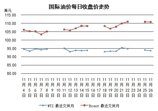 另外,美國民間大型調(diào)查公司世界大企業(yè)聯(lián)合會(huì)公布的11月美國消費(fèi)者信心指數(shù)為70.4,低于前一月數(shù)據(jù),而且低于路透社調(diào)查的72.9,這也壓迫油價(jià)下行。伊朗核問題取得階段性成果,地緣政治風(fēng)險(xiǎn)減弱也利空油價(jià)。