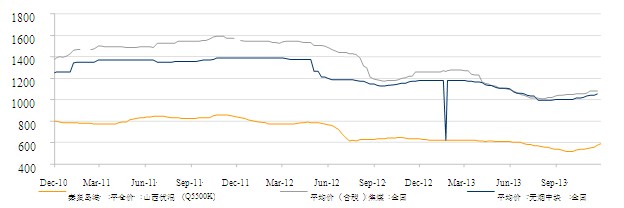 圖1:2010年12月~2013年11月國內主要煤種周均價(單位:元/噸)