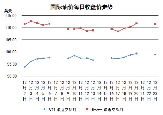 由于圣誕節來臨,在連日上漲之后部分交易者選擇落袋為安,因此當日紐約WTI、倫敦布倫特價格都有小幅下降。但是目前導致油價上漲的不安因素仍未消除:法國道達爾三座煉廠工人持續罷工、利比亞石油出口減少約100萬桶/日(當地有武裝組織在尋求更大的自治權)、南蘇丹動亂導致其24.5萬桶/日的石油產量受到威脅等(中石油已經將工人從油田撤出)。