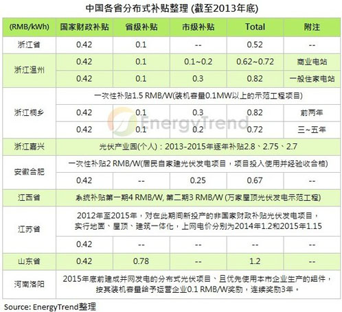 除了中國國家財政對于分布式系統(tǒng)的補貼外,各省、市級單位都為刺激地方發(fā)展提出各自補貼方案,吸引更多系統(tǒng)商與資金投入。但在此背景下,尚須觀察各省、市制定的補貼條件與金額是否合理,因從另一方面觀察,這樣的補貼政策會被視為地方補貼當?shù)仄髽I(yè)的一種方式,但對于計劃進入的非省、市內(nèi)的企業(yè)反而成了屏障。