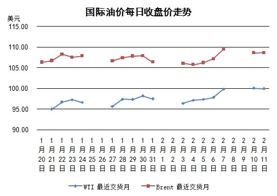 由于預計美國原油庫存將出現增加,而且前一日WTI價格超過100美元,市場警戒感增強,所以當日WTI價格小幅下跌。聯儲局主席耶倫出席眾議院金融服務委員會聽證會,表示會延續(xù)前任主席伯南克的貨幣政策,繼續(xù)以漸進的方式縮減買債規(guī)模。耶倫指,該方針改變的門檻設得頗高,除非經濟前景出現顯著變化,否則不會減慢買債步伐。聯儲局需時審視近日新增非農就業(yè)人數低於市場預期所帶來的重要性,但她重申,并無既定路線縮減資產購買。美國股市受到提振,但WTI油價反應有限。倫敦布倫特油價受嚴寒天氣持續(xù)和餾分油庫存預減影響當日小幅上漲。