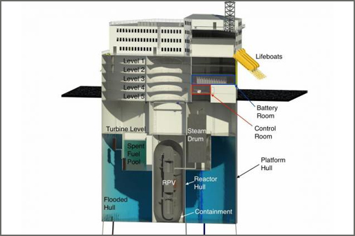 這一構想的平臺可以在船塢中建造,然后拖曳到距離海岸幾海里的較深海區。它可以通過海底電纜與電網相接。這種平臺可以避開地震,還能承受海嘯打擊。其設計結構能帶來足夠的安全性。特別是散熱器浸入海洋可以保證反應堆制冷的穩定可靠,并能避免外部干擾。