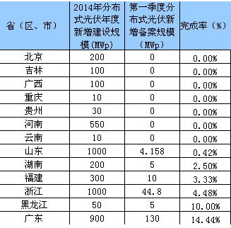 山東作為分布式光伏發展大省,2014年第一季度新增分布式備案容量僅0.415萬千瓦,約占年度規模的0.42%。此外,浙江省2014年度分布式光伏建設指導規模為100萬千瓦,而第一季度僅新增備案4.48萬千瓦;廣東第一季度分布式光伏建設情況較好,但新增備案容量也僅有13萬千瓦。部分省(區、市)第一季度新增備案分布式光伏情況見表1。