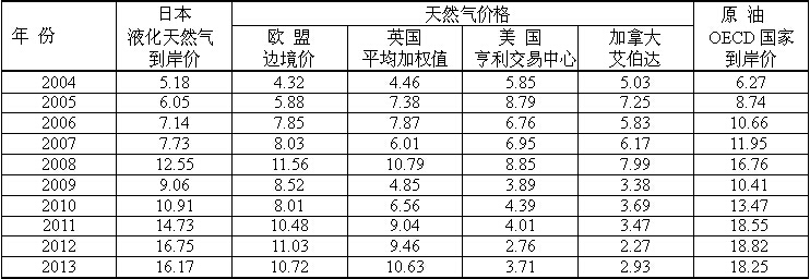 表1清楚地表明,這三種天然氣市場(chǎng)的價(jià)格差異,日本液化天然氣價(jià)格明顯與原油掛鉤,價(jià)格最高,十年漲3倍多。