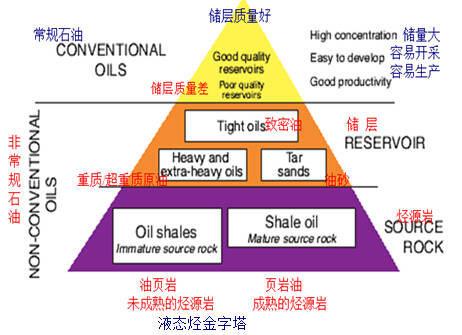 從液態烴金字塔來看,常規石油較非常規石油少得多。而非常規石油中富含干酪根的油頁巖儲量最大。