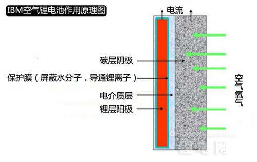 IBM空氣鋰電池的結構如圖所示,陽極為鋰金屬板,陰極為表面碳層,中間有兩層電解質,其中靠近鋰金屬電板一側的電解質負責接收由鋰金屬板釋放的鋰離子,而靠近碳層一側的電解質則負責把接收到的鋰離子更好地滲透至碳層。兩種電解質中間有阻擋膜,用以阻止不同層面物質之間的相互滲透與污染。