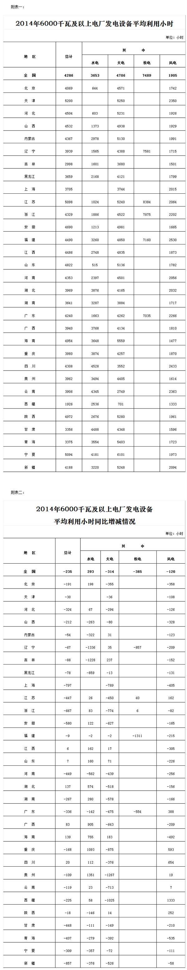 2014年全國6000千瓦及以上電廠發電設備平均利用小時及同比增減情況分別見附表1和附表2。