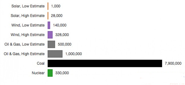 當然,上述圖表所呈現的數據并不太精確嚴謹,其僅是結合一些數據和實例進行的一種粗略評估,其并未衡量單位MWh發電裝機對鳥類帶來的影響,由于燃煤發電仍是美國較大的電力供應來源,因此其對鳥類帶來的災難影響看似更大一些。但實際上,如果我們結合美國能源信息署的數據,來計算單位MWh發電裝機對飛禽帶來的災難影響,會更清晰地了解這一事實。從下面的一張圖表我們就可以看到,在悲觀情景下,每1000MWh的太陽能和風力發電裝機對鳥類致死的影響僅次于燃煤發電。