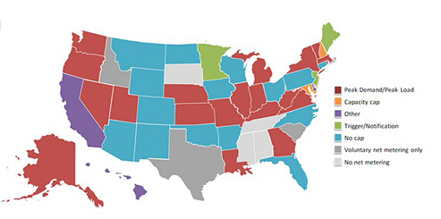 各州的凈計量電價制度上限值的定義。用紅色表示的州利用峰值需求計算上限值。