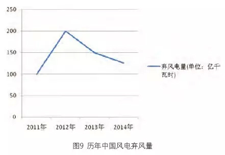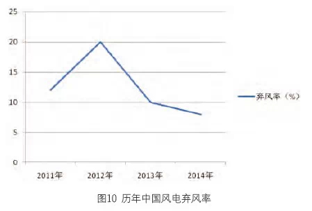 圖9、圖10顯示,棄風電量和棄風率相比2012年和2013年都有下降,棄風限電情況有所好轉。其中2014年中國風電平均棄風率為8%,同比下降4個百分點,達到近年來最低值,全國除新疆地區外棄風率均有不同程度的下降。