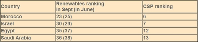 下表列出了中東北非地區上榜國家的可再生能源市場及光熱發電市場的詳細排名: