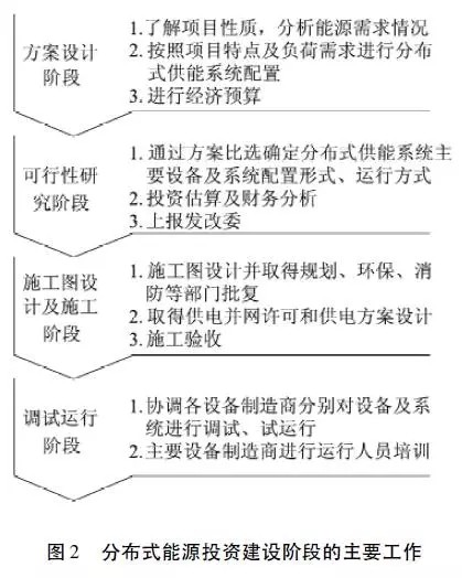 分布式能源投資建設(shè)階段的主要工作為:資金募集、分布式能源系統(tǒng)設(shè)備的采購、安裝和調(diào)試等,依次分為方案設(shè)計階段、可行性研究階段、施工圖設(shè)計及施工階段、調(diào)試運行階段,各階段的主要工作如圖2所示。