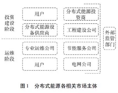 從市場角度看,各市場主體所處的市場地位不同,所具有的權(quán)責也存在差別。如,外部監(jiān)管部門(政府部門、行業(yè)協(xié)會等)主要為分布式能源的發(fā)展提供政策保障和外部管制;分布式能源投資商、金融機構(gòu)、設(shè)備供應商、工程建設(shè)公司等主體的合理投資和規(guī)范化建設(shè)共同推動了分布式能源的快速發(fā)展;專業(yè)運維公司、節(jié)能服務(wù)公司、用戶以及電網(wǎng)公司間的有效協(xié)作確保了分布式能源系統(tǒng)的正常運營。