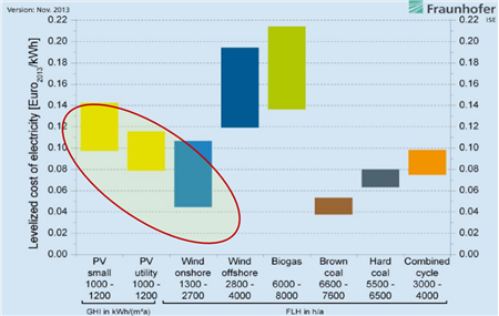 這是2013年歐洲的成本,最左邊是光伏,包括分布式,集中式的成本,光伏成本已經接近煤電等普通化石能源成本,到2020年會低于火電的成本。所以新能源的大規模利用已經有基礎了。