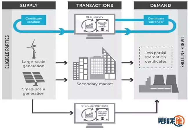澳大利亞是世界上最早在全國范圍內(nèi)實行可再生能源配額制的國家。2000年,澳大利亞政府通過《可再生能源法案》,發(fā)布強(qiáng)制性可再生能源目標(biāo),對相關(guān)電力批發(fā)商規(guī)定了購買一定比例可再生能源電力的法定義務(wù)。2001年4月1日,澳大利亞可再生能源證書系統(tǒng)在全國范圍內(nèi)正式運(yùn)行。從2011年1月1日開始,澳大利亞將可再生能源證書分為大規(guī)模證書(LGCs)和小規(guī)模證書(SGCs)兩種類型,其中大規(guī)模RECs主要面向發(fā)電站,小規(guī)模RECs主要面向太陽能熱水器、空氣源熱躉熱水器和小型發(fā)電機(jī)組。
