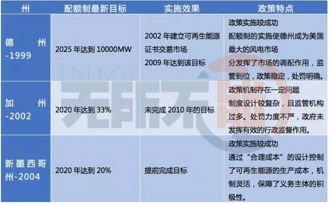其中,德克薩斯州、加利福尼亞州和新墨西哥州為美國實施可再生能源配額制比較典型的幾個地區(qū),其實施效果對比如下。