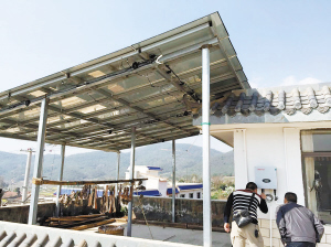 這是一個精準扶貧的生態環保示范項目,利用光伏發電技術發電,目前在安寧市八街街道辦事處相連村民委員會、窯坡村民委員會農戶家的房頂安裝了四套光伏發電陽光棚系統,搭建安裝高性能太陽能薄膜發電組件,采用弱光發電技術,光伏發電陽光棚系統功率從3千瓦到5千瓦。