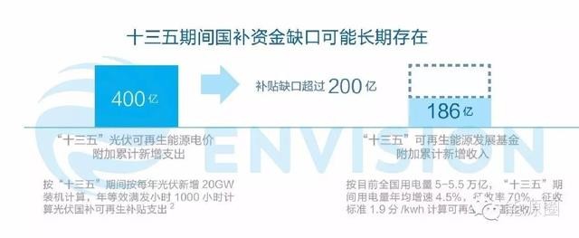 根據遠景能源阿波羅光伏的初步測算,“十三五”期間僅光伏新增裝機所需的補貼就達到400億元,而同期社會新增用電量帶來的可再生能源基金新增收入只有186億元,在不考慮存量缺口的情況下,又增加了新的資金缺口。