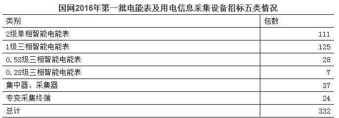 國網(wǎng)2016年第一批電能表及用電信息采集設(shè)備招標(biāo)活動中,72家供應(yīng)商在五類設(shè)備招標(biāo)中共中標(biāo)332個包。五類物資及包數(shù)分別為:2級單相智能電能表111包、1級三相智能電能表125包、0.5S級三相智能電能表28包、0.2S級三相智能電能表7包、集中器/采集器37包、專變采集終端24包。