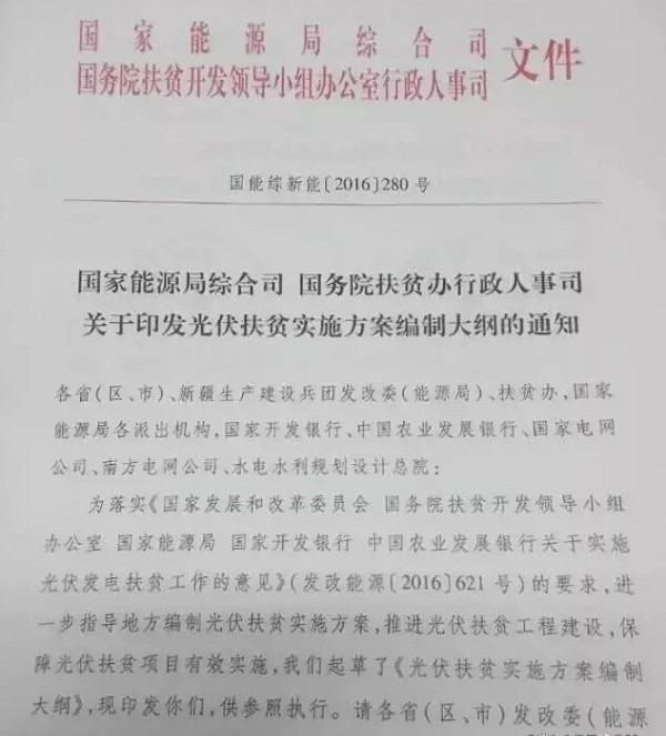 繼國家能源局4月底組織部分省區、電網公司、銀行和企業召開光伏扶貧推進會后,光伏扶貧試點實施方案編制大綱正式由國家能源局和國務院扶貧辦聯合印發。本批次項目申報材料的提交時間為5月15日。