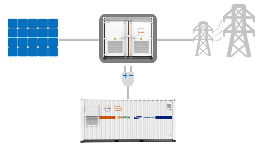 陽光三星為該項目提供全套的設計方案,包括2臺陽光三星PowCube 550儲能系統,該系統采用20呎集裝箱集成設計,每臺集裝箱集成550kWh三星三元鋰電池、直流變換器、BMS、智能溫控、自動消防、配電、通訊等全套設備,并采用直流側接入方案。所謂直流側接入,即在不改變現有光伏電站原有設備、配置的情況下,在光伏組件與光伏逆變器的直流母線端并聯儲能系統。