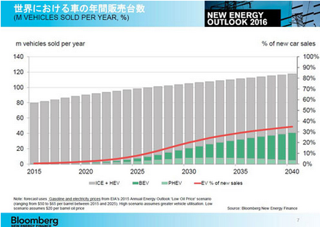 2040年,EV用鋰離子蓄電池組的價格將由2015年的350美元/kWh降至120美元/kWh。蓄電池組的成本降低會推動EV需求高漲。