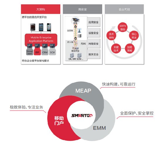 從官方資料看,SmartGO包含三個部分:MEAP、EMM、移動門戶;SmartGO.MEAP提供了基于HARP混合開發框架,解決的是我們常說的跨平臺移動應用開發問題。而對于企業常見的各業務系統集成問題。SmartGO.MEAP提供了超過10種連接器,能便捷的與各類后臺業務系統集成,并能夠在高并發、大數據量訪問的同時保障穩定、可靠的運行。