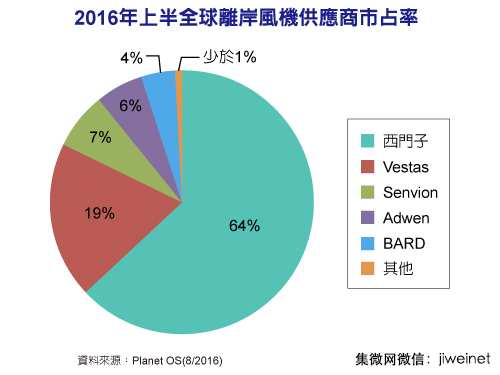 全球離岸風力發(fā)電迎來新一波發(fā)展熱潮。據(jù)研究機構(gòu)Planet OS統(tǒng)計,2016年上半全球離岸風力發(fā)電容量比2015年增加4.2%,總發(fā)電容量達到12,672百萬瓦(MW)。值得注意的是,2016年上半新增的114個并網(wǎng)型風力發(fā)電機組全部都由西門子(Siemens)拿下。也由于西門子在2016年上半大獲全勝,拿下全球所有并網(wǎng)型離岸風機市場,其全球累積市占率進一步拉高到64%,與排名第二的Vestas差距拉大。其他主要風機供應商還有Senvion、Adwen等業(yè)者。