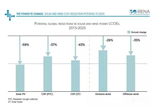 根據國際可再生能源署9月3號發布的報告預測,光伏、光熱、陸上和海上風電成本將大幅度下降: