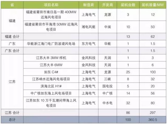 截至2015 年底,中國已建成的海上風電項目裝機容量共計1014.68MW。其中,潮間帶累計風電裝機容量達到611.98MW,占海上裝機容量的60.31%,近海風電裝機容量402.7MW 占39.69%。截至2015 年底,海上風電機組供應商共10 家,累計裝機容量達到100MW 以上的機組制造商有上海電氣、華銳風電、遠景能源、金風科技,這四家企業海上風電機組裝機量占海上風電裝機總量的86.6%。