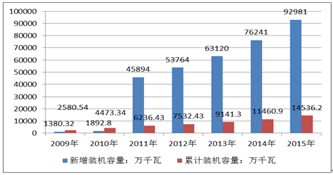 2015年,全國(除臺灣地區外)新增裝機容量30753MW,同比增長32.6%,新增安裝風電機組16740臺,累計裝機容量145362MW,同比增長26.8%,累計安裝風電機組92981臺。