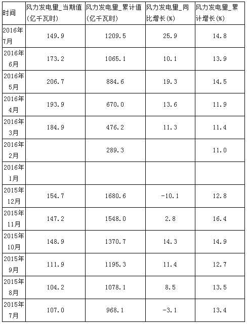 2016年風力發電不管是同比增長還是累計增長都達到了10%以上,7月當月風電量相比去年7月同比增長40%以上,1-7月累計風電量相比去年同期增長了約25%。整體來看,從去年7月到今年5月,當月風電量一直呈上升趨勢,而6、7月份發電量反而逐漸下降。