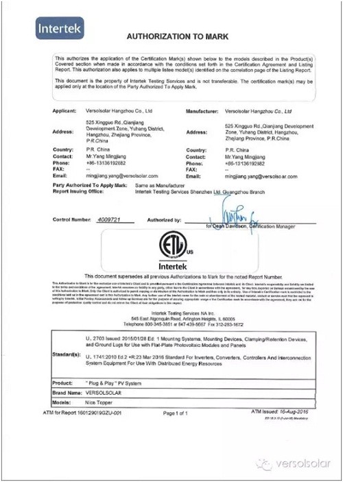 傳統針對光伏產品的各類權威認證都是各部分獨立進行的,如光伏組件、光伏支架、逆變器等。帷盛的Nice Topper作為一款將光伏組件、光伏支架、微型逆變器集成為一體的革命性光伏產品,經過淋雨測試、防火測試、接地測試、載荷測試等一系列嚴苛的測試,最終順利通過獲得ETL證書,并且是ETL全球首個以“整體光伏發電系統”(組件+支架+逆變器)進行認證的產品。
