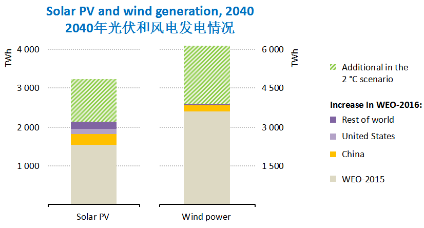 受政策和能源轉型的影響,光伏和風電的前景將更加廣闊。IEA預測,到2040年,可再生能源發電將占總發電量的37%,在2℃情景中該比例更是達到將近60%,其中,供熱和交通領域的新增潛力最大。在政策的推動和電力市場設計改變的影響下,可再生能源將開啟發展的新篇章。