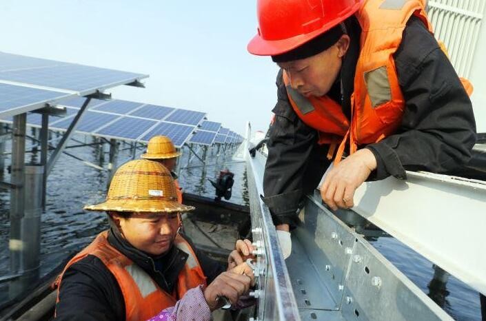12月16日下午,在寧波慈溪杭州灣的周巷水庫湖面上,零下5度的低溫,寒風刺骨,幾名身穿橘黃色救生衣的施工作業人員正在進行電纜敷設作業,這個寧波市最大的漁光互補發電項目已進入最后收官階段。